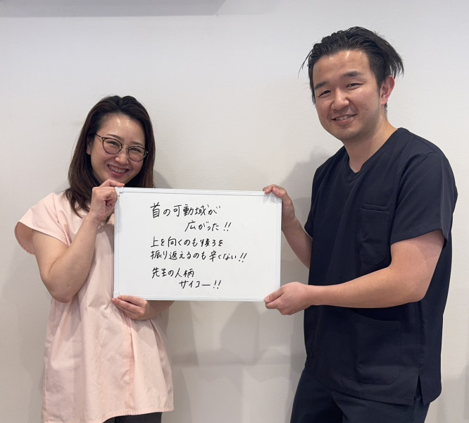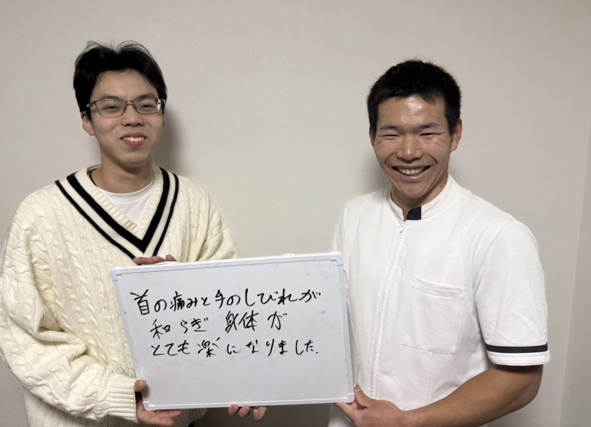 「手の痺れが軽減された!」 数ヶ月前から仕事中に首が回らなくなるほどの痛みと、指先までのしびれに襲われ、不安でマッサージに通ったり市販薬を飲み続けたりしていました。 こちらで首の歪みや神経の圧迫を丁寧にケアしてもらったことで、今ではしびれが消え、首の動きも驚くほどスムーズになりました。手のしびれは「もう治らないのでは」と怖かったですが、確実に変化を実感できるので、同じように神経の症状で不安を抱えている方は迷わず先生を頼ってみてください! ※効果には個人差があります |