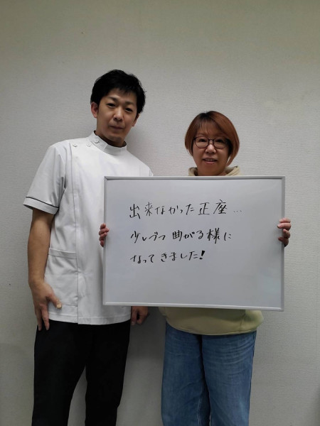 「出来なかった正座が、少しずつ曲がる様ようになってきました!」 以前から膝の違和感と痛みがあり、正座がまったく出来ない状態でした。 ※効果には個人差があります |